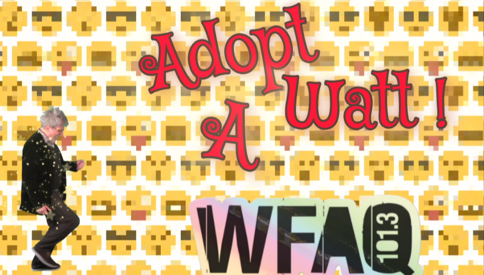 For just $10.13 (101.3 FM, get it?) gets you on-air Thank You's on the Shout Out Loud! list on WFAQ LP FM! You get to name your Watt, and are bumper to the Top of the list for any requests. Email: radio@wfaq.com to let us know the name of your Watt & requests! This is limited to 100 ( 100 watts, get it?) thank you! Adopt Yours Today! Click the thumbnail > Click The Pic below for a video of our Ol' Commander Todd sellin' it ...